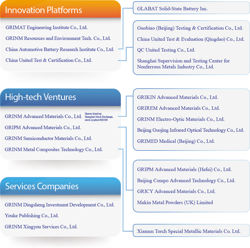 GRINM GROUP (formerly known as China General Research Institute for Nonferrous Metals), founded in 1952, is a large R&D organization and high-tech incubator with strong core competence in nonferrous metals industry in China. Focusing on three core business segments, advanced nonferrous metal materials and processing, mineral processing and metallurgy, analysis and testing, we have more than 40 corporate family members, including platform innovation companies, high-tech companies, investment companies, publishing and services companies, and have established R&D and production bases throughout China in Beijing, Hebei, Shandong, Shanghai, Anhui, Sichuan, Chongqing, Fujian as well as in UK and Canada. .