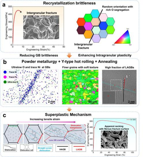 該研究成果由中國(guó)有研智能傳感功能材料國(guó)家重點(diǎn)實(shí)驗(yàn)室聯(lián)合有色金屬制備加工國(guó)家重點(diǎn)實(shí)驗(yàn)室,以及浙江大學(xué)、南京理工大學(xué)等優(yōu)勢(shì)高校共同完成。創(chuàng)新團(tuán)隊(duì)通過粉末冶金、Y型熱軋和熱處理的工藝組合,制備出具有室溫超塑性的完全再結(jié)晶純鉬材料。通過在晶界處設(shè)計(jì)超低氧濃度消除鉬的本征晶界脆性,且與高比例的<110>//RD織構(gòu)和小角度晶界相結(jié)合,實(shí)現(xiàn)了晶內(nèi)位錯(cuò)網(wǎng)絡(luò)的有序演變以及小角度晶界處(≤15°)的位錯(cuò)穿越。這些因素的協(xié)同作用極大抑制了鉬的晶間脆性斷裂傾向,獲得最高108.7%的室溫總延伸率。該發(fā)現(xiàn)揭示了難熔金屬室溫超塑性變形的新機(jī)制,為制造苛刻應(yīng)用場(chǎng)景所需難熔金屬及合金提供了理論支撐與可行路線。