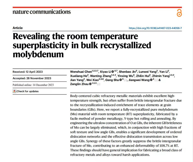 近日,有研工研院在體心立方難熔金屬?gòu)?qiáng)韌化方面取得重要進(jìn)展,所開發(fā)的純鉬材料經(jīng)1000~1700℃超高溫退火后,呈現(xiàn)出獨(dú)特的再結(jié)晶態(tài)室溫超塑性,突破了體心立方難熔金屬再結(jié)晶脆性的傳統(tǒng)行業(yè)認(rèn)知。部分研究成果以論文形式發(fā)表于國(guó)際頂級(jí)學(xué)術(shù)期刊Nature Communications(IF=16.6)(DOI: doi.org/10.1038/s41467-023-44056-7)。