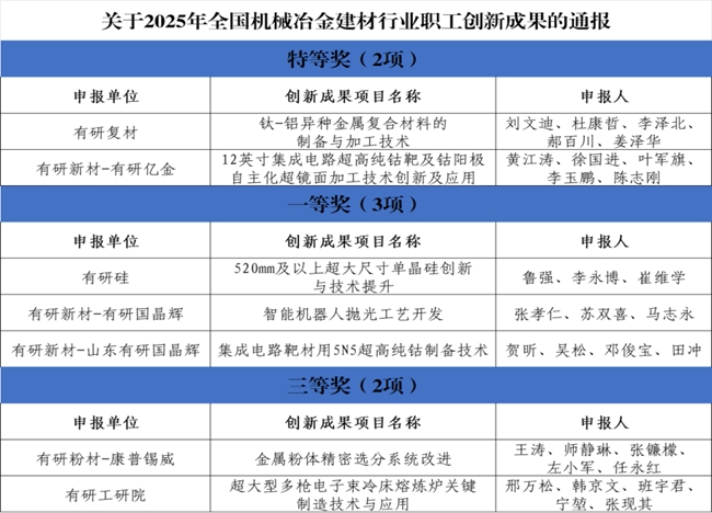 近日,2025年全國機械冶金建材行業(yè)職工創(chuàng)新成果評選揭曉,中國有研申報的7項職工創(chuàng)新成果均獲獎,其中,特等獎2項、一等獎3項、三等獎2項。