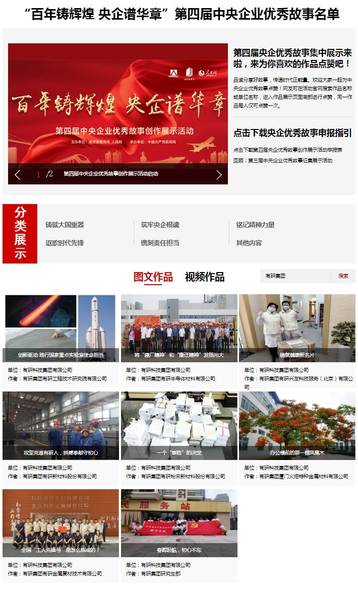 7月30日,由國資委宣傳局、人民網(wǎng)聯(lián)合主辦,中國共產(chǎn)黨新聞網(wǎng)承辦的“百年鑄輝煌 央企譜華章”慶祝建黨百年暨第四屆中央企業(yè)優(yōu)秀故事發(fā)布活動在北京舉辦。活動共收到各中央企業(yè)推薦報送的圖文及視頻作品1800余件,評選出一等獎30件,二等獎50件,三等獎80件,優(yōu)秀獎120件,有研集團推薦報送的作品“攻堅克難有研人,拼搏奉獻守初心”榮獲三等獎。
