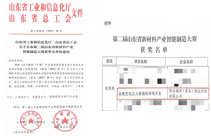 2023年2月21日,山東省工信廳和山東省總工會聯(lián)合發(fā)文公布了第二屆山東省新材料產(chǎn)業(yè)智能制造大賽獲獎名單,國合青島《高精度低應(yīng)力磨拋機研制開發(fā)》項目榮獲優(yōu)秀獎。
