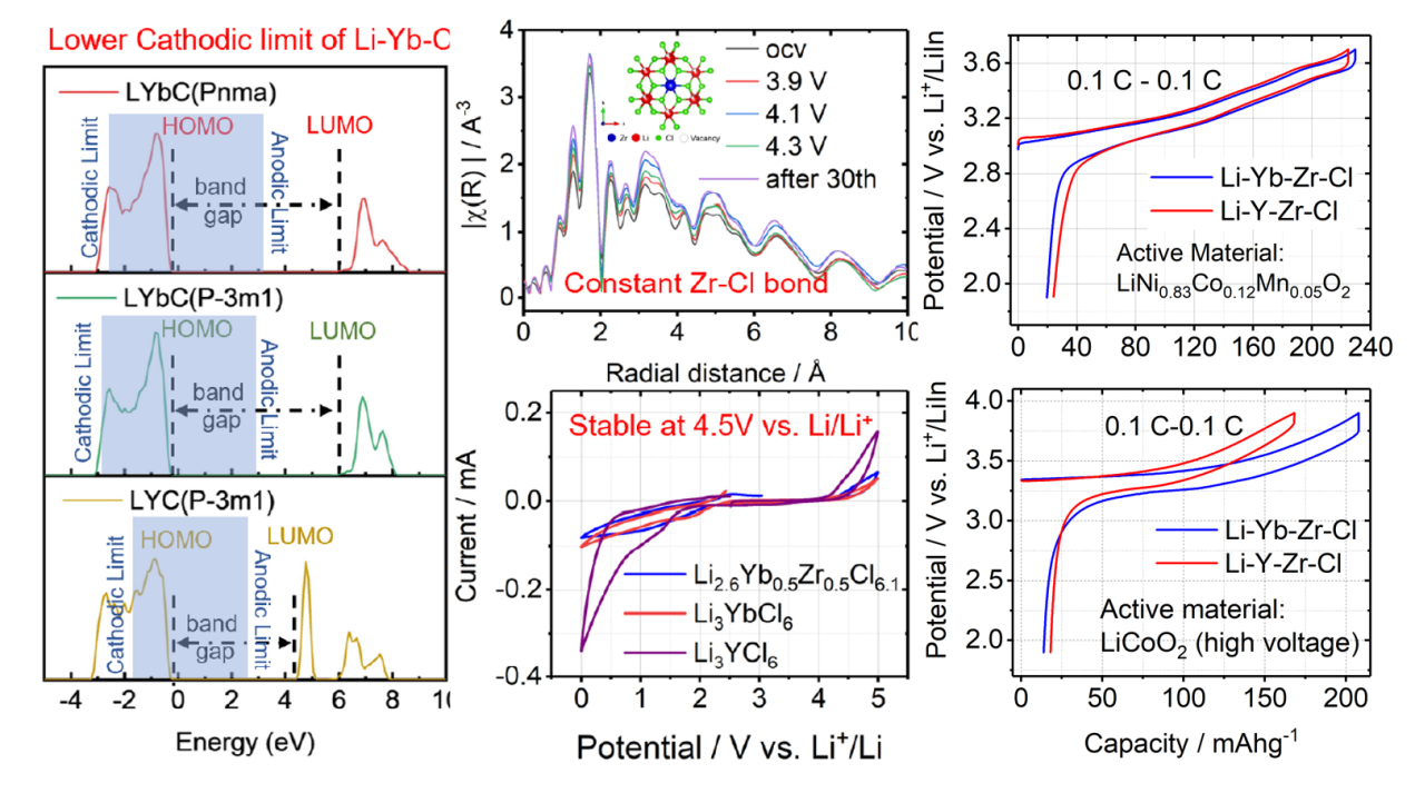 近日,國(guó)聯(lián)研究院創(chuàng)新團(tuán)隊(duì)在新型稀土基鹵化物固態(tài)電解質(zhì)研究方面再獲新成果,成功研發(fā)出一種新型多金屬氯化物固態(tài)電解質(zhì)。該固態(tài)電解質(zhì)結(jié)合了Li-Yb-Cl的高電位和Zr-Cl鍵的高穩(wěn)定性,表現(xiàn)出了高達(dá)4.5V vs. Li+/Li的氧化穩(wěn)定電位;通過(guò)協(xié)同調(diào)節(jié)Li+載流子和空位濃度進(jìn)一步提升離子電導(dǎo)率,使得采用該固態(tài)電解質(zhì)的高電壓正極材料全固態(tài)電池表現(xiàn)出優(yōu)異的循環(huán)壽命和綜合電化學(xué)性能,為高離子電導(dǎo)率、高電壓固態(tài)電解質(zhì)設(shè)計(jì)及高能量密度全固態(tài)電池研發(fā)方面提供了新思路,對(duì)助推固態(tài)電池規(guī)模應(yīng)用具有重要意義。部分成果發(fā)表在能源領(lǐng)域著名期刊《Nano Energy》(IF=17.881)上發(fā)表,題目是“Origin of High Electrochemical Stability of Multi-Metal Chloride Solid Electrolytes for High Energy All-Solid-State Lithium-Ion Batteries”。