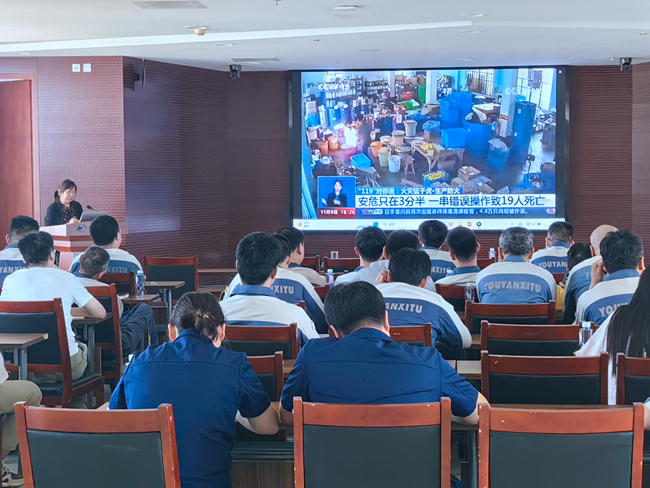 公司各部門積極開展安全知識目視化宣傳活動。各事業(yè)部在生產(chǎn)車間、公共辦公區(qū)、公告欄等張貼安全月宣傳海報、安全標(biāo)語、主題條幅等,通過目視化管理開展宣傳活動;綜合管理部、生產(chǎn)管理部、磁材事業(yè)部、光功能事業(yè)部利用大屏幕、電視每天滾動播放安全月相關(guān)專題片,利用班前班后會、用餐等碎片化時間強(qiáng)化安全宣傳;金屬事業(yè)部開展“安全生產(chǎn)大家談”活動,各班組充分交流經(jīng)驗(yàn)舉措和意見建議;化合物事業(yè)部召開安全月專題會議,要求部門全體員工從自身做起,積極參加安全月活動,共同創(chuàng)造安全、和諧的工作環(huán)境。