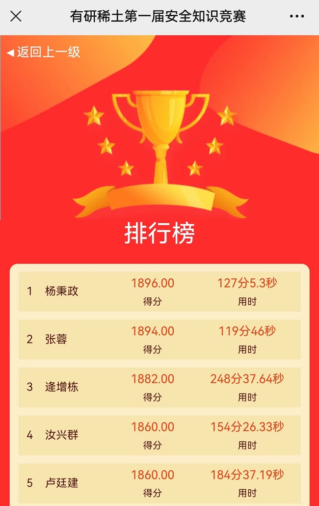 為深入開(kāi)展全國(guó)第22個(gè)“安全生產(chǎn)月”活動(dòng), 深化“人人講安全,個(gè)個(gè)會(huì)應(yīng)急”的主題,有研稀土分三個(gè)階段組織開(kāi)展了安全應(yīng)急知識(shí)競(jìng)賽活動(dòng),包括線上競(jìng)賽、分區(qū)選拔、線下決賽。