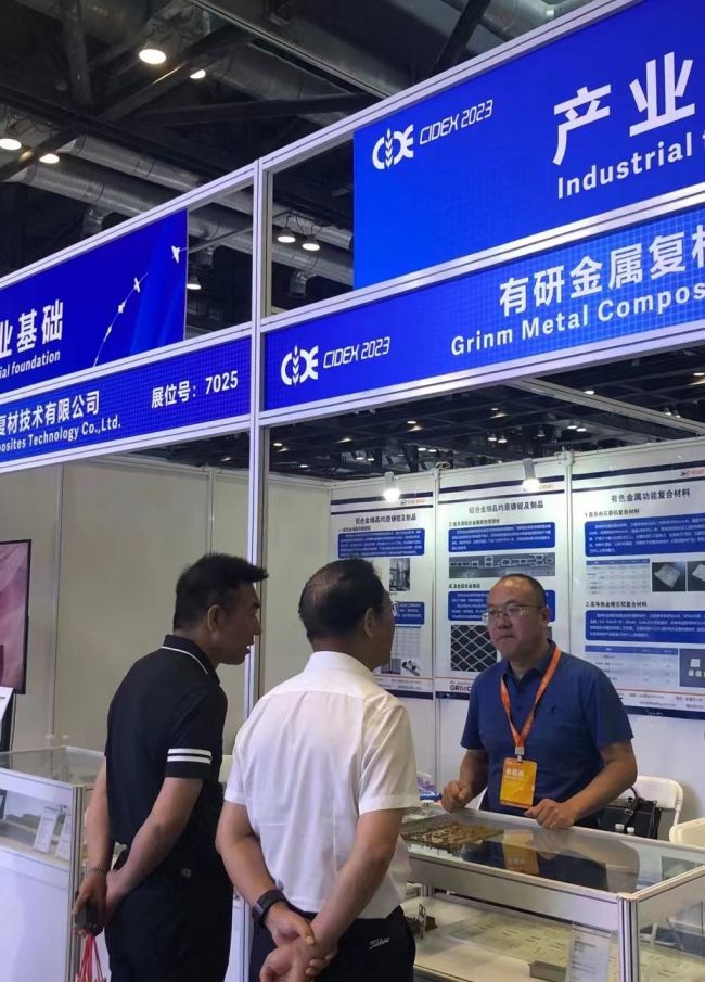 本屆大會,有研復(fù)材采用原創(chuàng)技術(shù)為軍工電子行業(yè)提供散熱解決方案,在高導(dǎo)熱金屬基功能復(fù)合材料領(lǐng)域取得重要原創(chuàng)性突破,圍繞國防軍工電子及高端民用電子散熱需求開發(fā)了高導(dǎo)熱高強(qiáng)度石墨鋁復(fù)合材料,突破了此類材料的性能極限,材料制備技術(shù)屬于國內(nèi)首創(chuàng)。開發(fā)的石墨鋁均熱板、面板等產(chǎn)品在國產(chǎn)重點裝備上批量應(yīng)用,形成良好的技術(shù)引領(lǐng)和產(chǎn)業(yè)推動作用。有研復(fù)材創(chuàng)新采用自主開發(fā)粉末冶金技術(shù),研制出綜合性能優(yōu)異的電子封裝用硅鋁復(fù)合材料,主要性能超越進(jìn)口材料,達(dá)到國際領(lǐng)先水平。牽頭制定了硅鋁國家軍用標(biāo)準(zhǔn),有力推動了國產(chǎn)硅鋁材料批量應(yīng)用,成功實現(xiàn)進(jìn)口替代,為武器裝備關(guān)鍵材料的自主可控做出貢獻(xiàn)。同時,依托國家有色金屬復(fù)合材料工程技術(shù)研究中心近30年的鋁合金粉末冶金技術(shù)沉淀,開發(fā)并通過各類臺架考核的某型飛機(jī)鋁基復(fù)合材料鍛件,產(chǎn)品疲勞壽命優(yōu)于國外同類產(chǎn)品,成功實現(xiàn)進(jìn)口替代。展會現(xiàn)場,有研復(fù)材為參觀客戶提供了全面而專業(yè)的解答與服務(wù)。有研復(fù)材展臺的“高導(dǎo)熱石墨鋁復(fù)合材料”、“高導(dǎo)熱金剛石鋁復(fù)合材料”、“硅鋁復(fù)合材料”、“梯度復(fù)合材料”、“高強(qiáng)高韌鋁基復(fù)合材料”、“高精密高模量鋁基復(fù)合材料”等產(chǎn)品備受關(guān)注。