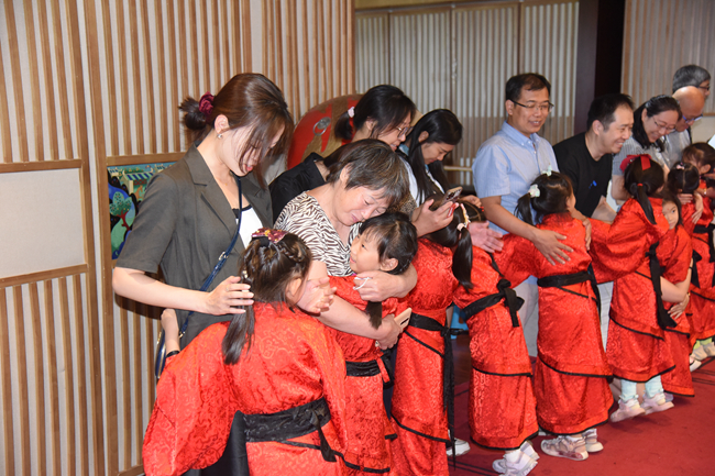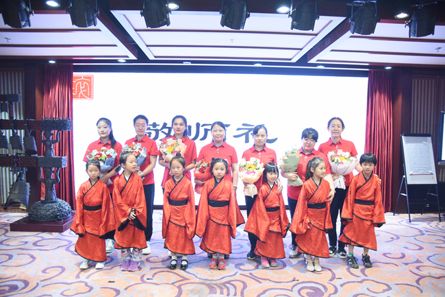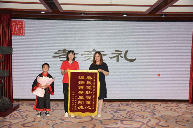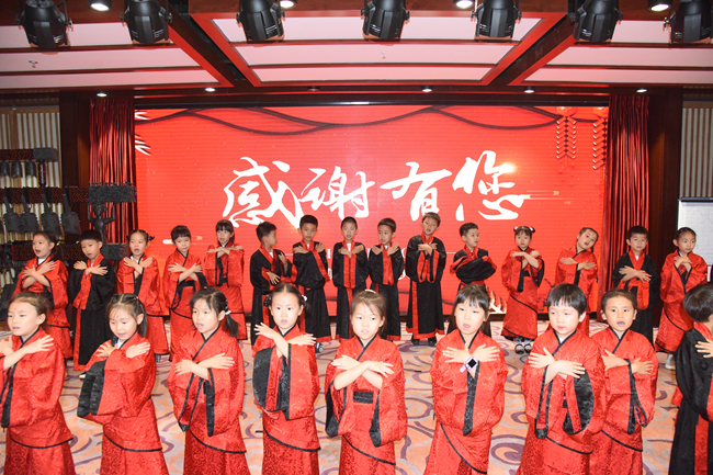孩子們端身正意,肅整衣冠,向父母行拱拜禮。父母是孩子的第一任啟蒙老師,孩子們向家長行感恩禮,感謝父母對自己無私的關(guān)懷和愛護(hù)。