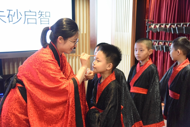 朱砂啟智又稱“開天眼”。在古代,學(xué)童入學(xué)讀書前,都會(huì)有啟蒙師長用紅色的朱砂在學(xué)子們的額頭正中點(diǎn)上紅痣。寓意開啟智慧,眼明心亮,以此寄托美好的愿望。