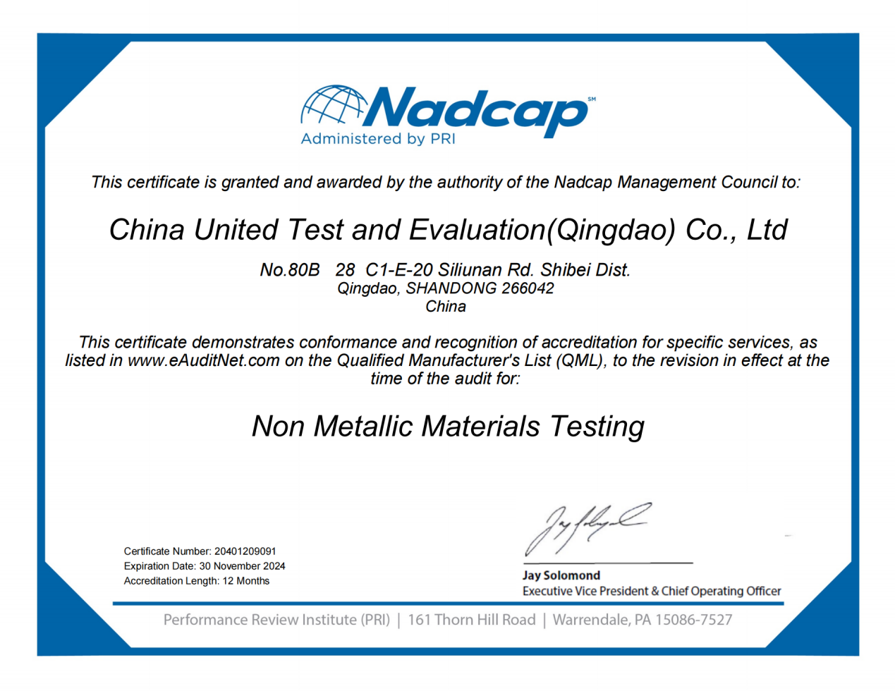 經(jīng)過多年籌劃和精心準(zhǔn)備,國合通用(青島)測試評價有限公司近期通過了NADCAP NMMT(非金屬材料)檢測實驗室認(rèn)證。加上2020年7月通過的NADCAP MTL(金屬材料)檢測實驗室認(rèn)證,國合青島成為全國同時通過NADCAP 金屬材料和非金屬材料檢測實驗室認(rèn)證的五家實驗室之一。