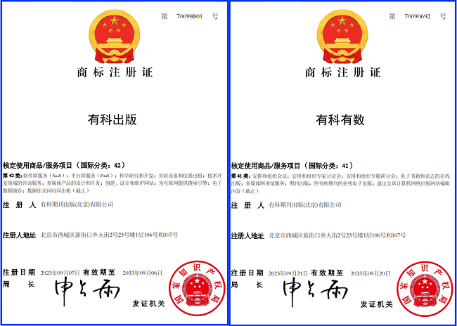 近日,國家知識產(chǎn)權(quán)局向有科出版頒發(fā)商標(biāo)注冊證,有科出版成功注冊“有科出版”及“有科有數(shù)”商標(biāo)。