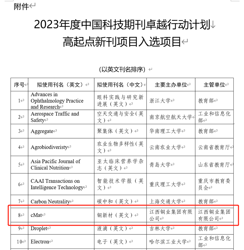 11月2日,中國科學(xué)技術(shù)協(xié)會發(fā)布《關(guān)于下達(dá)2023年度中國科技期刊卓越行動計(jì)劃高起點(diǎn)新刊項(xiàng)目入選項(xiàng)目的通知》。有科出版與江銅集團(tuán)組織申報(bào)的《cMat》(《銅新材(英文)》)成功入選,是有科出版繼2021年《鏈(英文)》(《Chain》)、2022年《智能材料與系統(tǒng)(英文)》(《IntelliSys》)、《元資源(英文)》(《MetaResource》)后連續(xù)第三年入選高起點(diǎn)新刊項(xiàng)目,同時為江西省實(shí)現(xiàn)了高起點(diǎn)新刊的重大突破。
