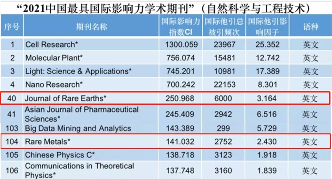 2021年12月6日,有研集團主辦的《稀有金屬(英文版)》(Rare Metals)、《稀土學(xué)報(英文版)》(Journal of Rare Earths)雙雙入選2021年“中國最具國際影響力學(xué)術(shù)期刊”榜單,兩刊連續(xù)十年蟬聯(lián)該稱號。