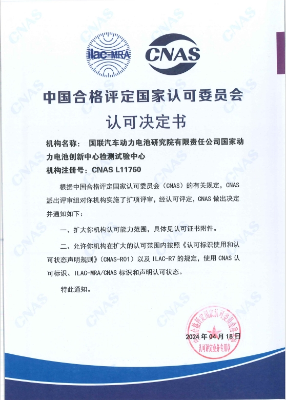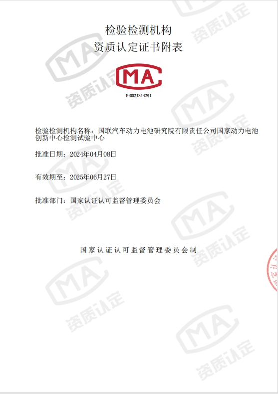 近日,國聯(lián)研究院國家動力電池創(chuàng)新中心檢測試驗中心順利通過中國合格評定國家認可委員會(CNAS)及國家認證認可監(jiān)督管理委員會(CMA)擴項評審,新增GB/T 36276-2023及GB/T 31467-2023標(biāo)準(zhǔn)認可能力,現(xiàn)已正式公布。
