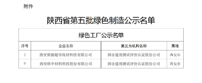近日,陜西省工業(yè)和信息化廳公布第五批綠色制造名單,經(jīng)國合通測評價并推薦的西安聚能超導(dǎo)線材科技有限公司、西安歐中材料科技股份有限公司2家企業(yè)榮登榜單,榮獲陜西省級“綠色工廠”稱號。