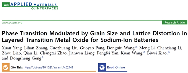 此外,團(tuán)隊(duì)針對O3型材料的相變與循環(huán)穩(wěn)定性的構(gòu)效關(guān)系,在《ACS Applied Materials & Interfaces》上發(fā)表了題為“Phase Transition Modulated by Grain Size and Lattice Distortion in Layered Transition Metal Oxide for Sodium-Ion Batteries”(影響因子9.5)的成果。該研究指出,O3型層狀正極材料脫鈉過程中產(chǎn)生的滑移是引起劇烈體積變化以及材料顆粒裂紋的主要原因,通過控制更小的晶粒尺寸及扭曲程度更大的過渡金屬-氧八面體可以有效降低滑移的剪切應(yīng)力,從而提升材料的循環(huán)壽命。