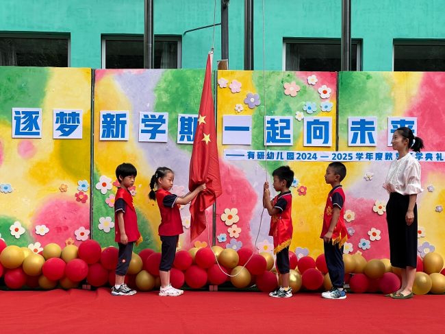 9月2日上午,有研幼兒園全體師幼聚集在操場,帶著希望,帶著憧憬,舉行了新學期的開學典禮。大班升旗手高舉著五星紅旗入場,在莊嚴的國歌聲中,五星紅旗冉冉升起。