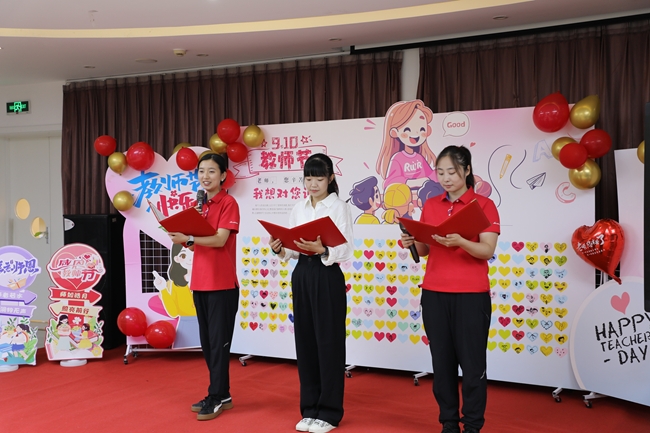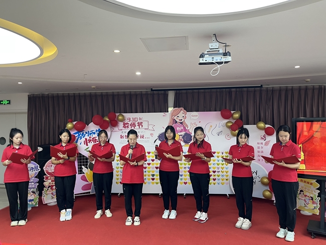 活動在孩子們稚嫩嘹亮的歌聲中拉開了序幕“聽我說,謝謝您...”優(yōu)美動聽的童聲合唱表達了孩子們對教師濃濃的感恩之情。教師們也用深情的詩朗誦展現(xiàn)了逐夢前行的理想信念和對教師職業(yè)全心全意的熱愛。
