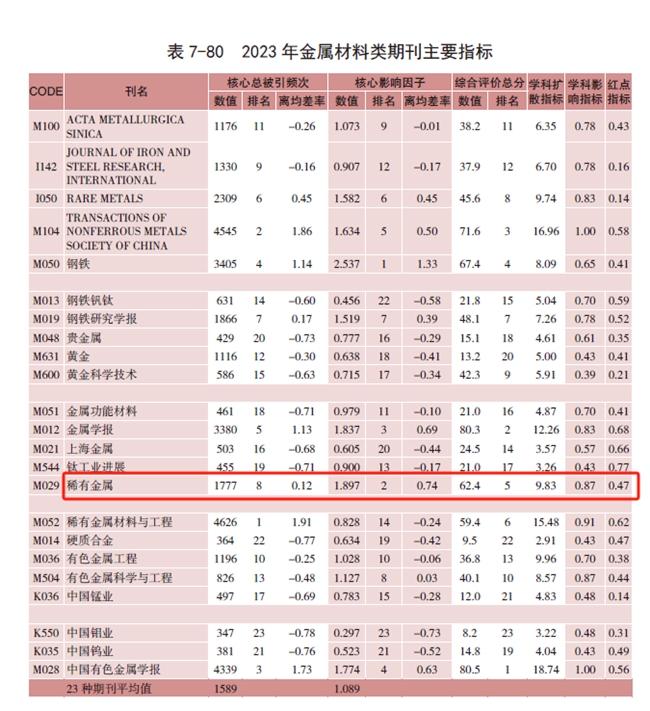 9月20日,由中國科學(xué)技術(shù)信息研究所主辦的“2024年中國科技論文統(tǒng)計(jì)結(jié)果發(fā)布會(huì)暨中國一流科技論文世界影響力評(píng)價(jià)論壇”在北京召開。根據(jù)會(huì)議發(fā)布的《中國科技期刊引證報(bào)告》,《稀有金屬》2023年度核心影響因子(CJCR)為1.897,較2022年度(1.751)提升8%,位列金屬材料學(xué)科第二(2/23)。