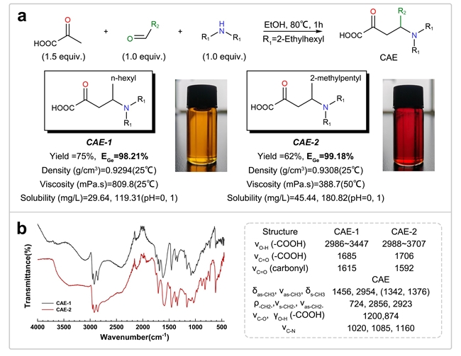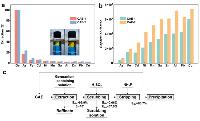 高品質(zhì)有色金屬綠色特種冶金國(guó)家工程研究中心長(zhǎng)期耕耘稀有金屬分離純化,近期王良士教授團(tuán)隊(duì)在戰(zhàn)略金屬鍺的萃取分離領(lǐng)域取得了研究進(jìn)展(CN202410095293X)。針對(duì)現(xiàn)有肟類(lèi)、胺類(lèi)萃取體系水溶性大、易降解等問(wèn)題,團(tuán)隊(duì)開(kāi)展了萃取劑分子結(jié)構(gòu)設(shè)計(jì),并合成了鍺的特效新型羰基酸萃取劑(CAE),酸性環(huán)境下溶損降低85%以上。通過(guò)羰基氧原子和羧基氧原子與鍺形成穩(wěn)定的五元環(huán)配位結(jié)構(gòu),實(shí)現(xiàn)了鍺的高效萃取和選擇性,與砷、鐵、鎘、鎳、錳、鎵、鋁、鋅、鉛和銅等雜質(zhì)元素分離系數(shù)高達(dá)103以上?;谘芯刻岢龅逆N萃取官能團(tuán)和成環(huán)形式,可合成出多種新型鍺萃取劑,該研究方法對(duì)相關(guān)萃取劑的開(kāi)發(fā)具有一定的指導(dǎo)與借鑒作用。研究工作得到國(guó)家重點(diǎn)研發(fā)計(jì)劃支持,成果發(fā)表在分離純化領(lǐng)域著名期刊Separation and Purification Technology,為推動(dòng)鍺的綠色、低碳和高效分離純化提供了新途徑。