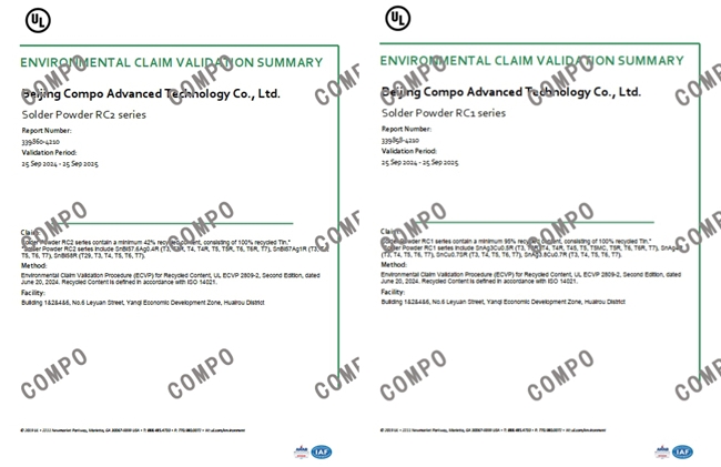 近日,康普錫威Solder Powder RC1 Series(Sn-Ag-Cu錫焊粉系列)和Solder Powder RC2 Series(Sn-Bi-Ag錫焊粉系列)產(chǎn)品通過全球知名認證公司UL Solutions嚴(yán)格的資料及生產(chǎn)現(xiàn)場審核,喜獲UL 2809標(biāo)準(zhǔn)的再生含量驗證證書。此證書也是國內(nèi)錫焊粉行業(yè)首張UL 2809驗證證書。