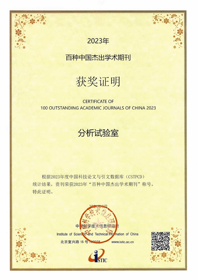 《分析試驗(yàn)室》獲評(píng)2023年度“百種中國(guó)杰出學(xué)術(shù)期刊”