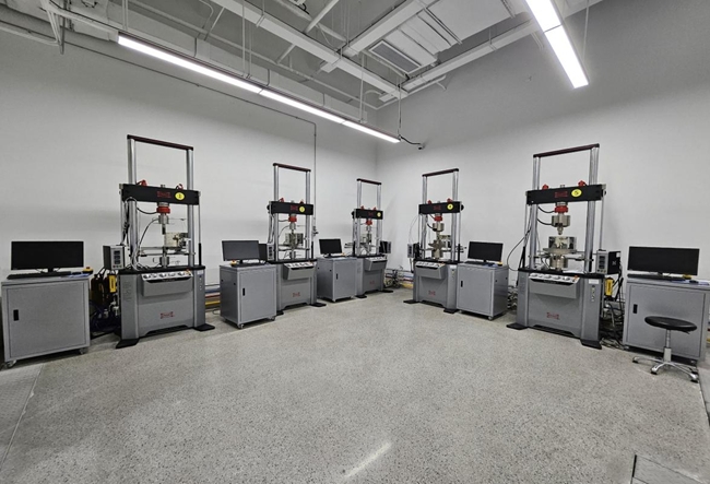 在一樓緊挨著的兩個低周疲勞實驗室,數(shù)十臺實驗機(jī)器正在反復(fù)進(jìn)行周期性加載,考驗材料在循環(huán)載荷的作用下的抗疲勞表現(xiàn),評價材料的疲勞壽命、斷裂韌性、裂紋擴(kuò)展速率等關(guān)鍵性能指標(biāo)。“我們平行地設(shè)立兩個實驗室,分別布置國外進(jìn)口和國內(nèi)自研設(shè)備,通過樣品的比對試驗來驗證國產(chǎn)設(shè)備的測試精度,目前仍在不斷推動大批量、長周期的樣品比對來驗證國產(chǎn)設(shè)備的穩(wěn)定性、可靠性,助力國產(chǎn)測試設(shè)備產(chǎn)業(yè)發(fā)展。”李楊解釋,過去新材料行業(yè)各鏈路環(huán)節(jié)都面臨國外技術(shù)“卡脖子”的問題,如今國產(chǎn)設(shè)備、傳感器等已在一步步突破,從跟跑到并跑,但仍需要不斷創(chuàng)新發(fā)展,以實現(xiàn)超越領(lǐng)跑。
