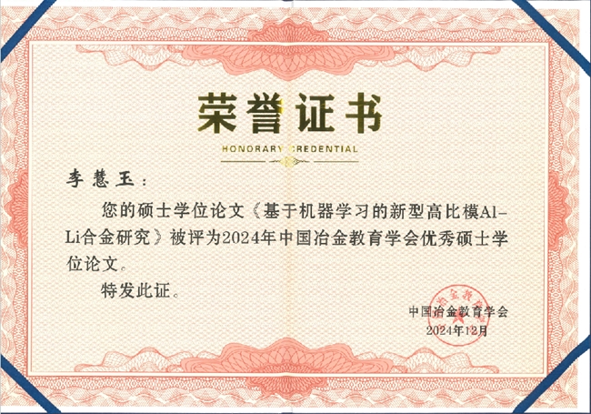 優(yōu)秀碩士學位論文獲得者李慧玉,有色金屬材料制備加工國家重點實驗室2023屆碩士畢業(yè)生,導師為李錫武,研究方向為基于機器學習的新型高比模Al-Li合金研究。攻讀學位期間,參與橫縱向科研項目3項,發(fā)表學術論文2篇,其中SCI論文2篇(JCR 1區(qū)1篇,3區(qū)1篇),累計影響因子13.17,獲評2023年度北京有色金屬研究總院優(yōu)秀碩士學位論文。