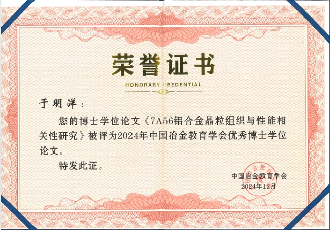 優(yōu)秀博士學位論文獲得者于明洋,有色金屬材料制備加工國家重點實驗室2023屆博士畢業(yè)生,導師為張永安,研究方向為7A56 鋁合金晶粒組織與性能相關性研究。攻讀學位期間,作為骨干成員參與國家重點研發(fā)計劃項目、XX項目等5項,共同主持制定行業(yè)標準1項,參與制修訂國家/行業(yè)標準3項,發(fā)表學術論文3篇,其中SCI論文2篇(均為JCR 2區(qū)),累計影響因子7.15,獲評2023年度北京有色金屬研究總院優(yōu)秀博士學位論文。