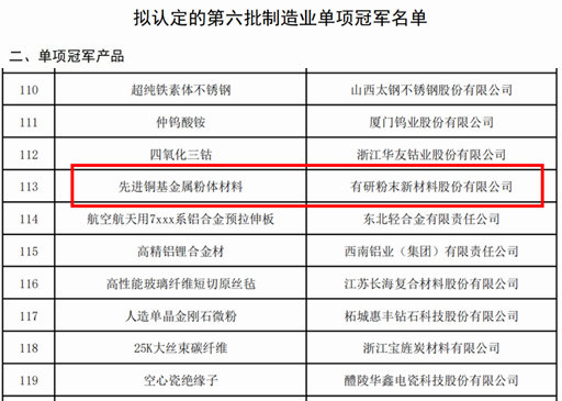 工信部日前公布了第六批制造業(yè)單項(xiàng)冠軍及通過復(fù)核的第三批制造業(yè)單項(xiàng)冠軍企業(yè)(產(chǎn)品),有研粉材榜上有名,“先進(jìn)銅基金屬粉體材料”入選制造業(yè)單項(xiàng)冠軍產(chǎn)品名單。