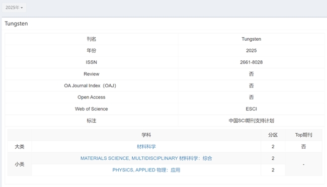 3月20日,《2025年中國科學(xué)院文獻情報中心期刊分區(qū)表》正式發(fā)布。有科出版負責(zé)出版的RARE METALS(《稀有金屬(英文版)》)、Journal of Rare Earths(《稀土學(xué)報(英文)》)繼續(xù)穩(wěn)居1區(qū)、入選Top。Journal of Analysis and Testing(《分析檢測(英文)》)新晉1區(qū)Top,Tungsten(《鎢科技(英文)》)新晉2區(qū),英文期刊影響力提升取得了新的突破。