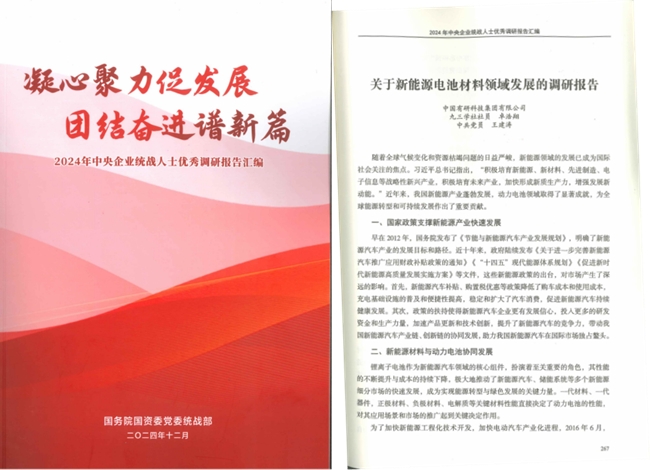 日前,國務(wù)院國資委黨委統(tǒng)戰(zhàn)部發(fā)布《2024年度中央企業(yè)統(tǒng)戰(zhàn)人士優(yōu)秀調(diào)研報告匯編》,國聯(lián)研究院九三學(xué)社社員卓浩翔、中共黨員王建濤聯(lián)合撰寫的調(diào)研報告《關(guān)于新能源電池材料領(lǐng)域發(fā)展的調(diào)研報告》入選匯編。
