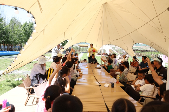 在基地的露營野餐環(huán)節(jié),家長和孩子們圍坐一起分享美食,交流著上午游玩的趣事,氛圍溫馨而融洽。午餐過后的擊鼓傳花互動環(huán)節(jié)將活動推向了另一個高潮。隨著鼓聲起落,“花”在孩子們手中歡樂傳遞,“幸運”的大小朋友紛紛上臺表演節(jié)目,唱歌、跳舞、講故事…… 精彩的表演贏得陣陣掌聲,現(xiàn)場氣氛熱烈歡快。