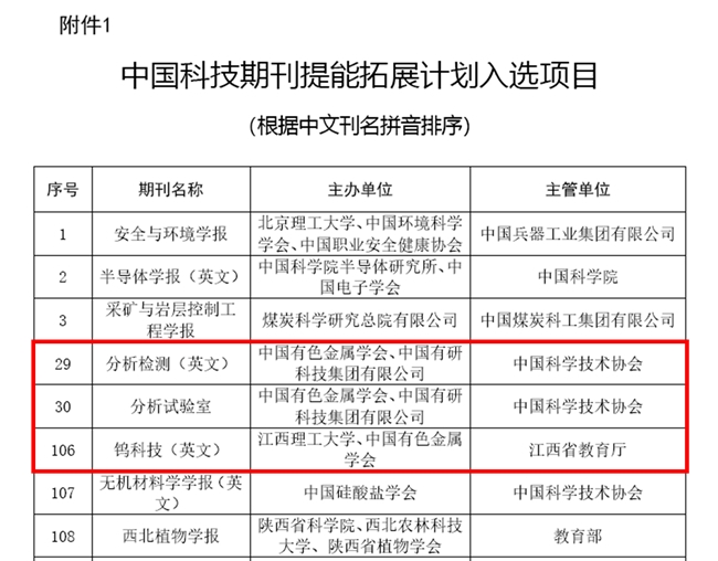 6月12日,中國科學(xué)技術(shù)協(xié)會(huì)發(fā)布《關(guān)于公布中國科技期刊提能拓展計(jì)劃入選項(xiàng)目的通知》,有科出版旗下《分析檢測(英文)》《鎢科技(英文)》《分析試驗(yàn)室》入選。