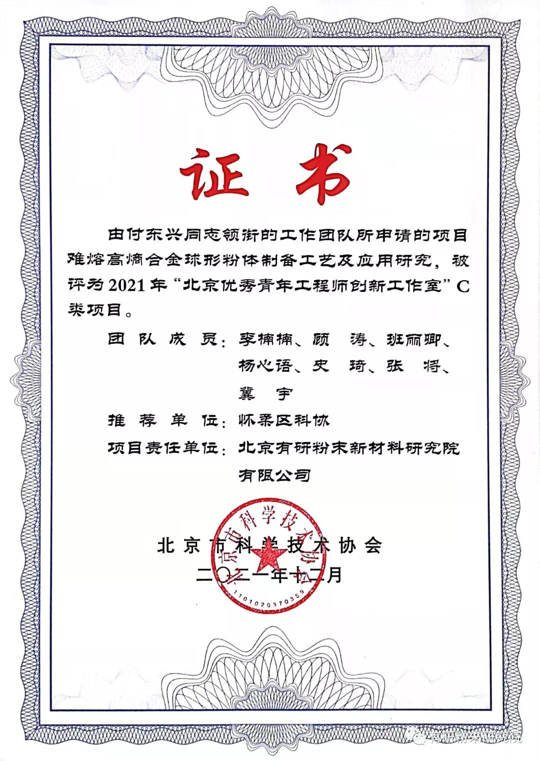 為激發(fā)青年科技人才創(chuàng)新熱情,促進(jìn)北京優(yōu)秀青年工程師成長成才,引導(dǎo)青年科技工作者自覺投身全國科技創(chuàng)新中心建設(shè),北京市科學(xué)技術(shù)協(xié)會開展北京優(yōu)秀青年工程師創(chuàng)新工作室建設(shè)工作。2021年12月,粉末研究院總經(jīng)理付東興領(lǐng)銜的工作團(tuán)隊(duì)獲批北京市科學(xué)技術(shù)協(xié)會的北京優(yōu)秀青年工程師創(chuàng)新工作室。