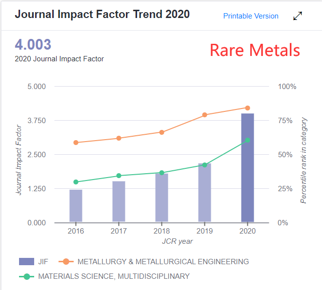 《稀有金屬(英文版)》2020年度影響因子達4.003,較上一年度(2.161)增長85%,連續(xù)5年刷新歷史新高;在JCR冶金工程學科(Metallurgy& Metallurgical Engineering)中排名13/80,繼續(xù)保持Q1區(qū),與上年度(17/79)相比提升4位;總被引頻次3520次,較上一年度(2209次)增長59%。《稀有金屬(英文版)》已成為有色金屬期刊集群國際影響力最高的期刊。