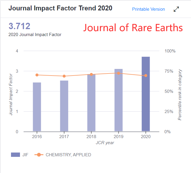 《稀土學報(英文版)》2020年度影響因子3.712,較上一年度(3.104)增長20%,連續(xù)6年刷新歷史新高;在JCR應(yīng)用化學學科(Chemistry, Applied)中排名23/74(2019年度排名20/71),繼續(xù)保持Q2區(qū);總被引頻次6419次,較上一年度(5310次)增長21%。