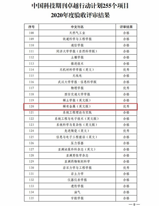 近日,中國(guó)科協(xié)學(xué)會(huì)學(xué)術(shù)部委托專(zhuān)業(yè)第三方機(jī)構(gòu)對(duì)2020年度中國(guó)科技期刊卓越行動(dòng)計(jì)劃部分項(xiàng)目(共255項(xiàng))進(jìn)行了集中驗(yàn)收,并于8月6日發(fā)布了2020年度中國(guó)科協(xié)科技期刊財(cái)政項(xiàng)目驗(yàn)收結(jié)論,有研集團(tuán)主辦、有科出版經(jīng)營(yíng)的英文刊《稀有金屬(英文版)》喜提優(yōu)秀驗(yàn)收評(píng)審成績(jī)。199種梯隊(duì)類(lèi)期刊中共有28種期刊的驗(yàn)收評(píng)審結(jié)果為優(yōu)秀。