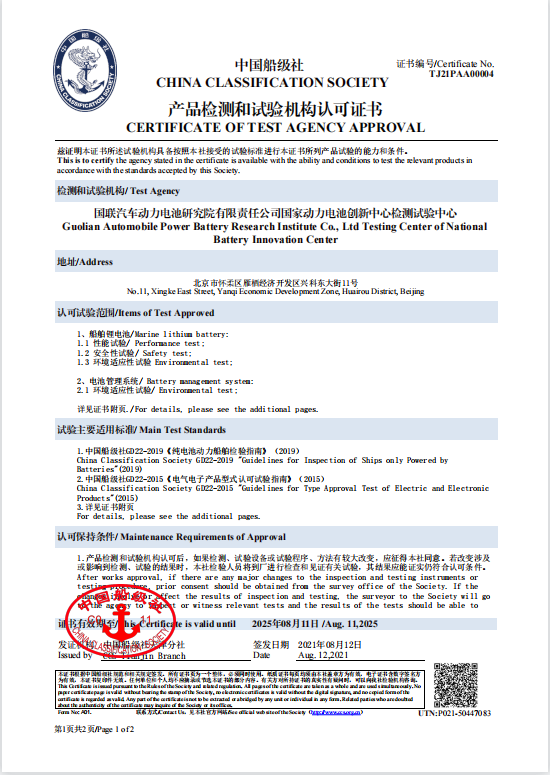 8月12日,國聯(lián)研究院國家動力電池創(chuàng)新中心檢測試驗中心正式取得中國船級社“船舶鋰電池性能、安全、環(huán)境適應性試驗”和“電池管理系統(tǒng)環(huán)境適用性試驗”資質(zhì),并順利獲得相應產(chǎn)品檢測和試驗機構(gòu)認可證書,成為具備依照中國船級社標準開展船舶鋰電池及電池管理系統(tǒng)產(chǎn)品相關(guān)檢測和試驗的第三方機構(gòu)。檢測試驗中心現(xiàn)已具備動力電池、儲能電池、船舶電池等多領(lǐng)域電池認證檢測資質(zhì)能力。