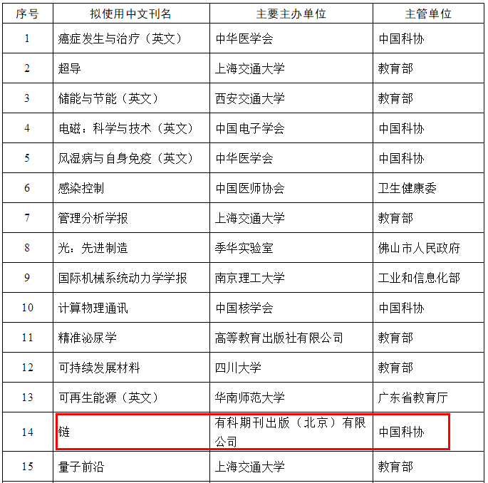 2021年9月26日,中國(guó)科學(xué)技術(shù)學(xué)會(huì)發(fā)布了《關(guān)于下達(dá)2021年度中國(guó)科技期刊卓越行動(dòng)計(jì)劃高起點(diǎn)新刊入選項(xiàng)目的通知》。根據(jù)《關(guān)于申報(bào)2021年度中國(guó)科技期刊卓越行動(dòng)計(jì)劃高起點(diǎn)新刊項(xiàng)目的通知》,按照《中國(guó)科技期刊卓越行動(dòng)計(jì)劃實(shí)施方案》和《中國(guó)科技期刊卓越行動(dòng)計(jì)劃評(píng)審細(xì)則》,經(jīng)項(xiàng)目申報(bào)、資格審查(166項(xiàng)通過(guò))、項(xiàng)目評(píng)審(92項(xiàng)進(jìn)入終評(píng))、結(jié)果公示,產(chǎn)生了入選項(xiàng)目共計(jì)30項(xiàng),有科期刊出版(北京)有限公司主辦的新刊Chain(《鏈》)成功入選。