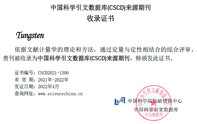 《鎢科技(英文)》創(chuàng)刊于2019年,江西省第一本英文期刊,是全球第一本主要報道鎢和相關(guān)金屬及其化合物的英文科技期刊。目前已被EI, Scopus等國際重要數(shù)據(jù)庫收錄。