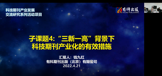4月21日,有科出版順利入選“‘學(xué)清刊壇’(第二期)—科技期刊產(chǎn)業(yè)發(fā)展交流研究系列活動(dòng)”項(xiàng)目。由中國科協(xié)學(xué)會(huì)服務(wù)中心主辦,同方知網(wǎng)(北京)技術(shù)有限公司承辦的“‘學(xué)清刊壇’(第二期)—科技期刊產(chǎn)業(yè)發(fā)展交流研究系列活動(dòng)”項(xiàng)目顧問委員會(huì)第一次會(huì)議在線上召開。董爾丹院士、黃小衛(wèi)院士、劉文清院士、中國有色金屬學(xué)會(huì)理事長賈明星及業(yè)內(nèi)專家學(xué)者共計(jì)59人參會(huì)。有科出版承擔(dān)了“學(xué)清刊壇(第一期)”子課題“中國科技期刊產(chǎn)業(yè)化發(fā)展戰(zhàn)略研討”并圓滿完成了相關(guān)活動(dòng),“學(xué)清刊壇(第二期)”子課題“三新一高”背景下科技期刊產(chǎn)業(yè)化的有效措施的研究”再次由有科出版承擔(dān),董事長、總經(jīng)理錢九紅出席并匯報(bào)今年的工作計(jì)劃和進(jìn)度情況。
