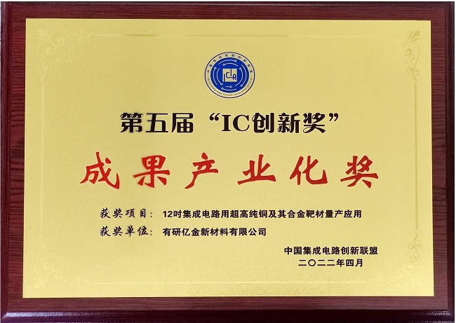 2022年7月9日,中國集成電路行業(yè)最具影響力的“2022中國集成電路創(chuàng)新聯(lián)盟大會”舉行,會上頒發(fā)了第五屆集成電路產業(yè)技術創(chuàng)新獎(簡稱“IC創(chuàng)新獎”)。有研億金憑借“12吋集成電路用超高純銅及其合金靶材量產應用”項目榮獲第五屆“IC創(chuàng)新獎-成果產業(yè)化獎”。