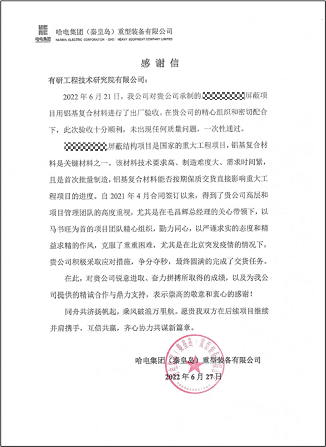 近日,哈電集團(tuán)(秦皇島)重型裝備有限公司向有研集團(tuán)所屬子公司有研工研院發(fā)來感謝信,感謝公司克服了技術(shù)要求高、制造難度大、需求時間緊等諸多困難,為某屏蔽項(xiàng)目貢獻(xiàn)了一批關(guān)鍵鋁合金復(fù)合材料,并一次性通過驗(yàn)收。