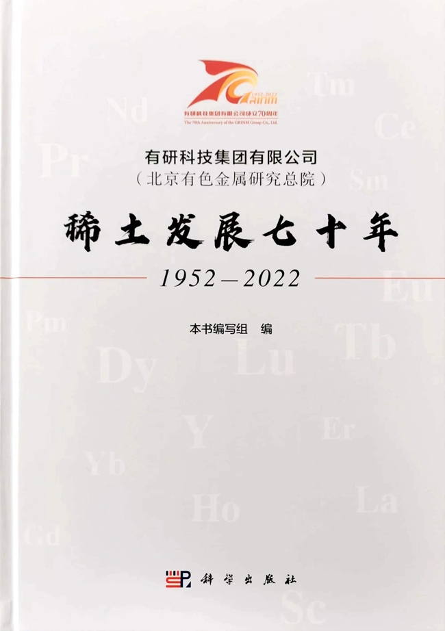 為了慶祝中國有研成立70周年暨稀土發(fā)展70年,在盧忠效教授、黃小衛(wèi)院士、李紅衛(wèi)教授、黃文梅教授的帶領(lǐng)下,有研稀土人查閱了大量歷史檔案資料和國內(nèi)有關(guān)文獻(xiàn)資料,訪問了數(shù)十位已退休稀土老專家和一線工作人員,向各方征集有關(guān)資料,歷經(jīng)10年終于整理編寫出《有研科技集團(tuán)有限公司(北京有色金屬研究總院) 稀土發(fā)展七十年 1952-2022》,并于日前在中國科學(xué)出版社正式出版發(fā)行。