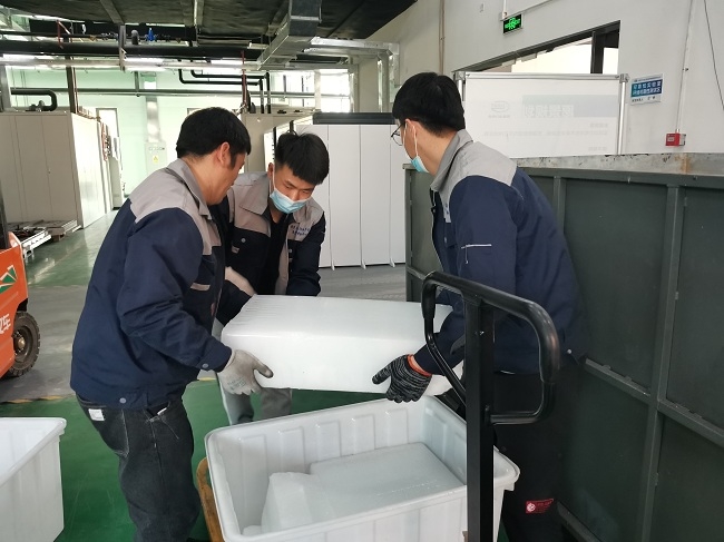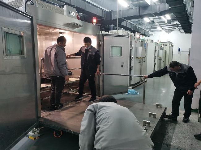 設計高溫—冰鹽水沖擊循環(huán)測試,驗證新能源車極端環(huán)境適應能力。高溫—冰鹽水沖擊循環(huán)測試尚無相關成熟檢測裝備,團隊技術人員組織研討,從客戶提供的僅有幾行的測試要求,逐條細化,討論每一步的細節(jié),估算每一步所需時間,想方設法設計測試方案,搭建測試條件,確保方案可行、滿足客戶需求。2021年的冬天,窗外大雪紛飛,測試工程師們4人一組,兩組人員兩班倒連續(xù)三天72小時不停歇,一次次從零下30攝氏度的低溫裝置中拉出冰塊實施高溫—冰水沖擊循環(huán)測試,安全高效地完成了測試,驗證了新能源車極端環(huán)境的耐久性,獲得了客戶高度評價。