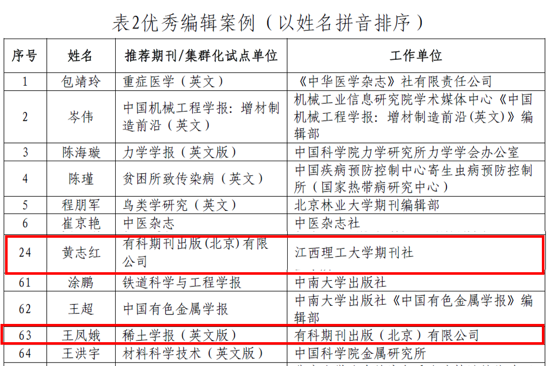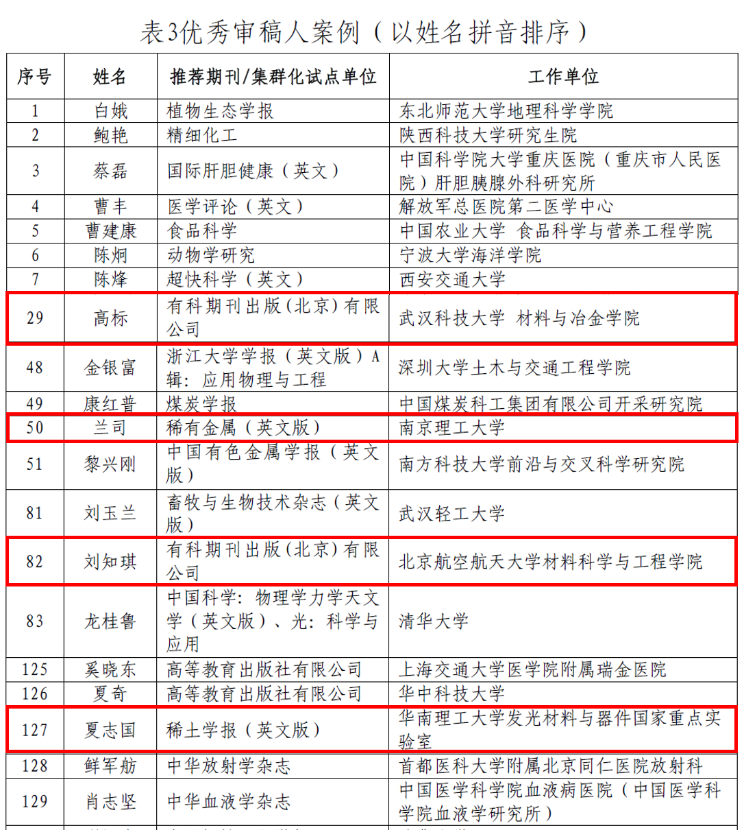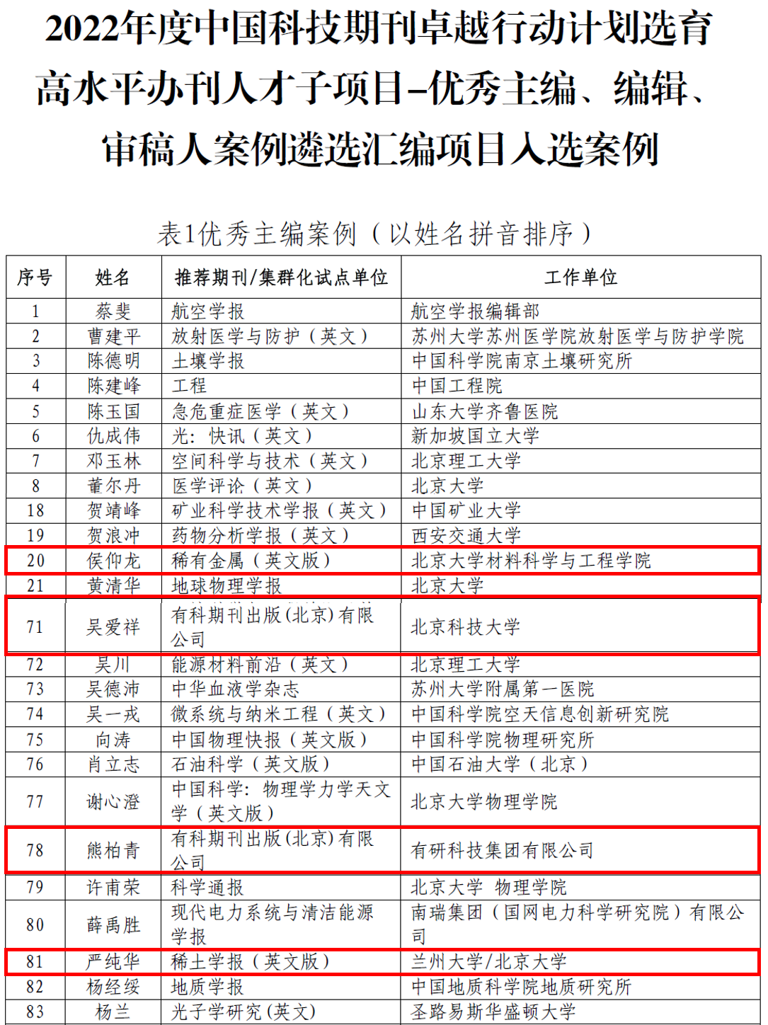 11月18日,中國(guó)科學(xué)技術(shù)協(xié)會(huì)發(fā)布了2022年度中國(guó)科技期刊卓越行動(dòng)計(jì)劃優(yōu)秀主編、優(yōu)秀編輯、優(yōu)秀審稿人入選名單,經(jīng)有科出版、《稀有金屬(英文版)》、《稀土學(xué)報(bào)(英文版)》推薦,中國(guó)科學(xué)院院士、蘭州大學(xué)校長(zhǎng)、《稀土學(xué)報(bào)(英文版)》主編嚴(yán)純?nèi)A,中國(guó)有研科技集團(tuán)有限公司總經(jīng)理、《稀有金屬》主編、《稀有金屬(英文版)》執(zhí)行副主編熊柏青,北京大學(xué)教授、《稀有金屬(英文版)》副主編侯仰龍,北京科技大學(xué)教授、《礦物冶金與材料學(xué)報(bào)(英文版)》主編吳愛(ài)祥當(dāng)選優(yōu)秀主編;江西理工大學(xué)期刊社社長(zhǎng)黃志紅,《稀土學(xué)報(bào)(英文版)》編輯部主任王鳳娥入當(dāng)選優(yōu)秀編輯;武漢科技大學(xué)教授高標(biāo),南京理工大學(xué)教授蘭司,北京航空航天大學(xué)教授劉知琪,華南理工大學(xué)教授夏志國(guó)當(dāng)選優(yōu)秀審稿人。