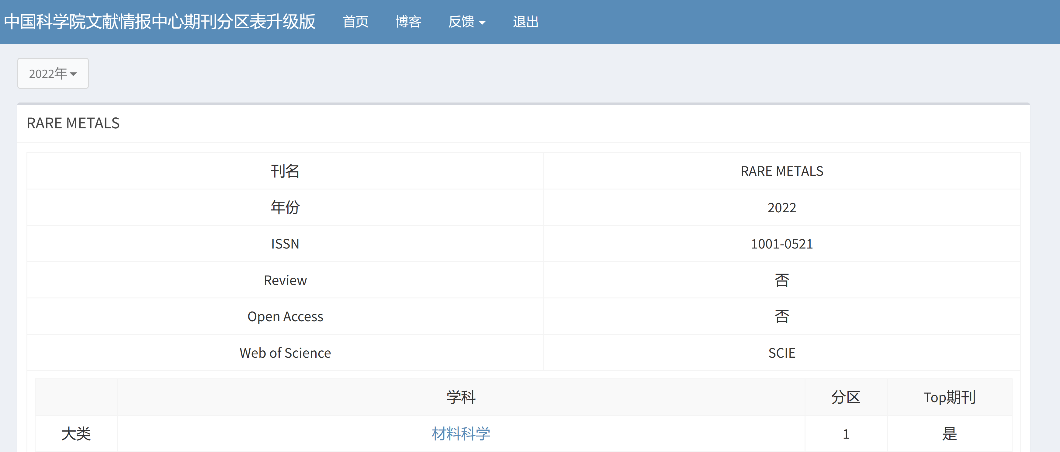 12月21日,《2022年中國科學(xué)院文獻(xiàn)情報(bào)中心期刊分區(qū)表》正式發(fā)布?!断∮薪饘伲ㄓ⑽陌妫罚≧are Metals)進(jìn)入2022年中科院期刊分區(qū)表材料科學(xué)1區(qū)TOP期刊行列。材料科學(xué)類共有410本期刊,其中進(jìn)入中科院期刊分區(qū)1區(qū)的有58本。