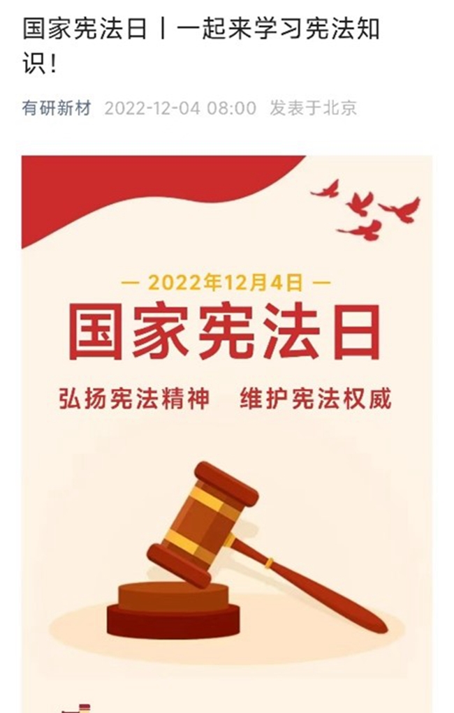 有研新材采取“線上+線下”聯(lián)動的宣傳方式,營造良好的法治氛圍。充分運(yùn)用微信公眾號等線上平臺,發(fā)布憲法宣傳掛圖和《國家憲法日一起來學(xué)習(xí)憲法知識》宣傳推文,宣傳現(xiàn)行憲法公布實(shí)施四十年來取得的偉大成就和有關(guān)憲法知識,增強(qiáng)了憲法宣傳的吸引力和感染力,不斷激發(fā)員工學(xué)習(xí)宣傳憲法的熱情。