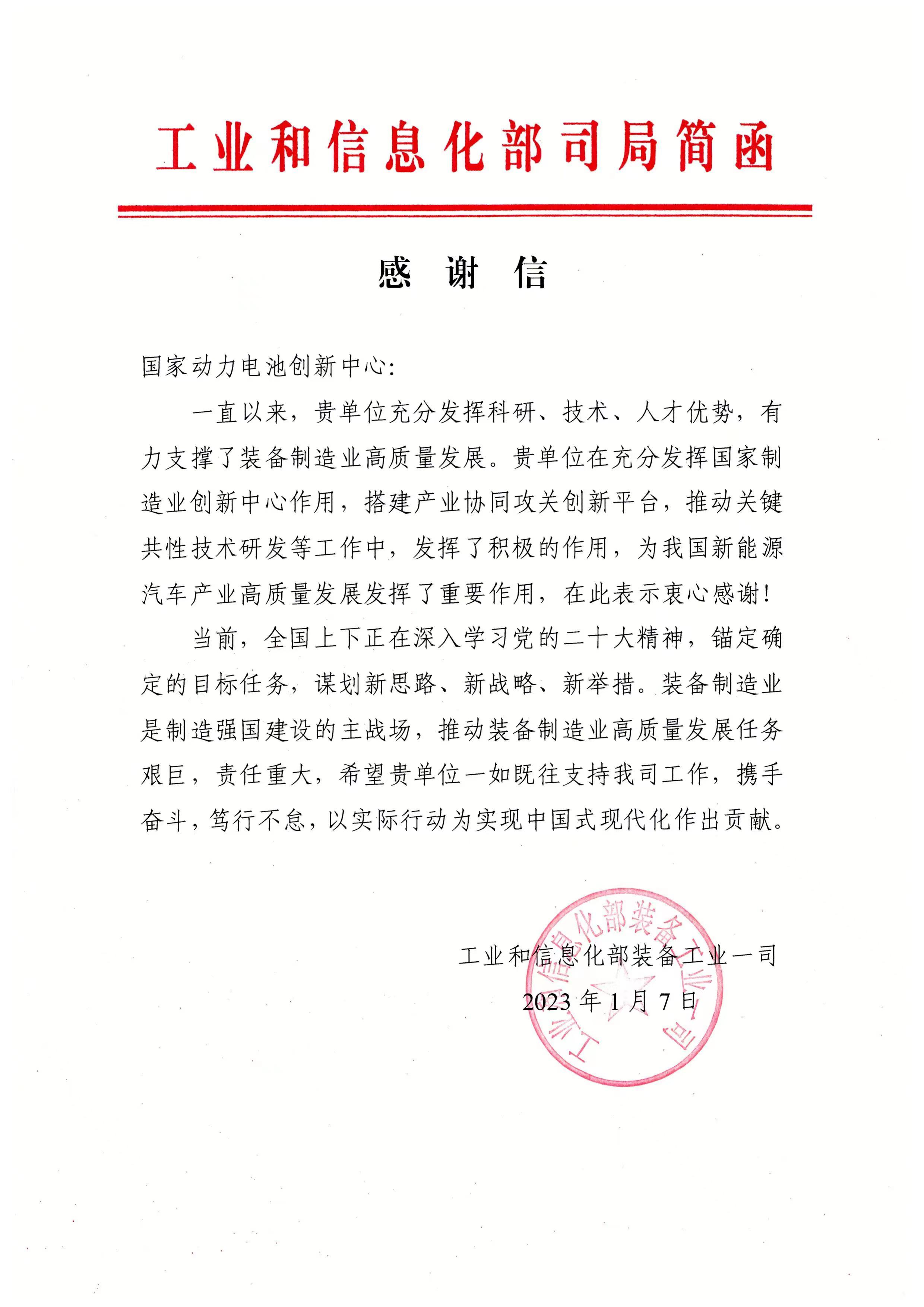 1月7日,工業(yè)和信息化部裝備工業(yè)一司向國家動力電池創(chuàng)新中心發(fā)來感謝信,對國家動力電池創(chuàng)新中心為我國新能源汽車產(chǎn)業(yè)高質(zhì)量發(fā)展發(fā)揮了重要作用,表示衷心感謝!