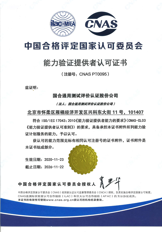 近日,國(guó)合通用測(cè)試評(píng)價(jià)認(rèn)證股份公司能力驗(yàn)證中心順利通過(guò)了中國(guó)合格評(píng)定國(guó)家認(rèn)可委員會(huì)(CNAS)認(rèn)可,證書(shū)編號(hào)為CNAS PT0095。這標(biāo)志著國(guó)合通測(cè)正式成為“能力驗(yàn)證提供者”。